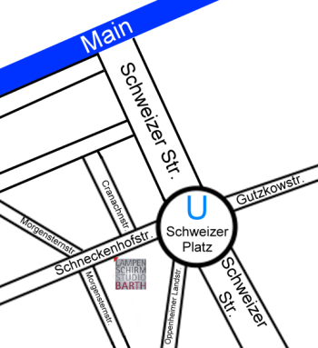 Das LAMPENSCHIRMSTUDIO BARTH liegt im Herzen von Sachsenhausen, 100 Schritte vom Schweizer Platz (U1, U2, U3, U8 und U9) entfernt. Der Otto-Hahn-Platz ist 3 Minuten entfernt (Straßenbahnlinie 15 und 16). Das Parkhaus Walter-Kolb-Straße ist zu Fuß 10 Minuten entfernt.